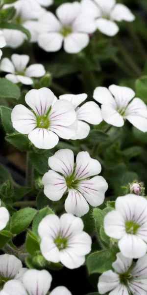 This cultivar of ‘mouse-eared baby’s breath’ has large, white flowers with a pink tint and purple veins over a spreading mat of mid green spoon-like leaves. A veritable magnet for bees and butterflies.