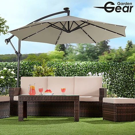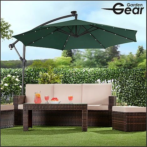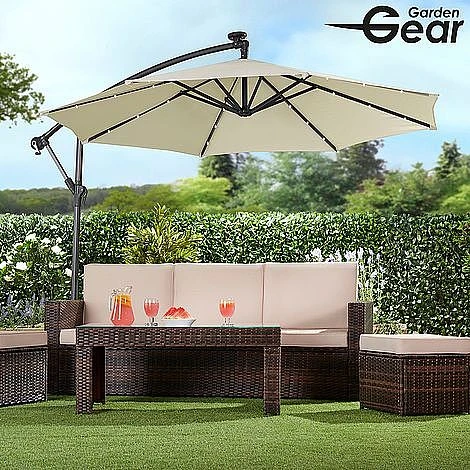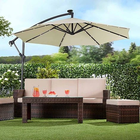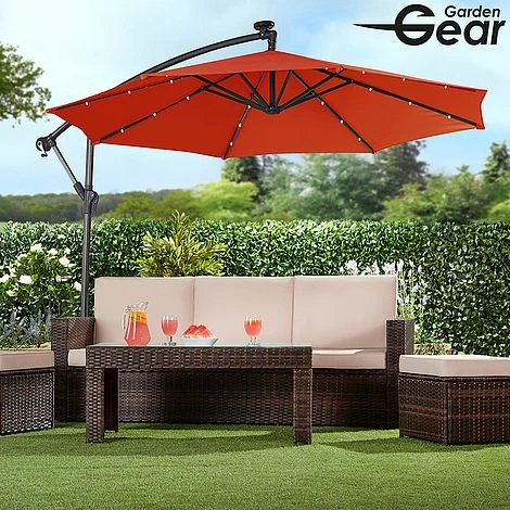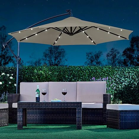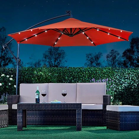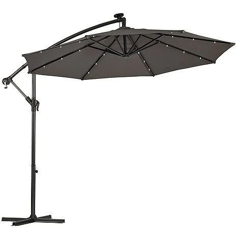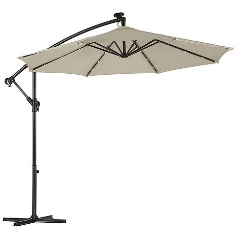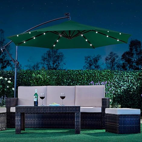 Light up your nights with this Solar LED Cantilever Parasol. Suitable for most patios or gardens, this cantilever parasol with 24 LED lights will allow you to sit outside long after the sun goes down. The canopy is structured around a solid powder coated frame made from steel ribs and an aluminium central pole with each rib containing three LED lights. Simply ensure the parasol is situated in a sunny place during the day and the solar panel will store the energy in the installed rechargeable batteries to light up your garden at night.