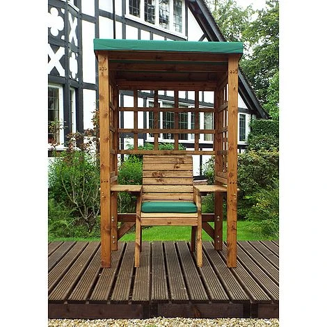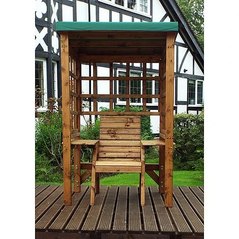 Wentworth Single Arbour: The Wentworth Single Arbour is ideal for people who seek a calming garden experience and are attracted to the natural beauty of wood. This gorgeous garden item boasts a trellis on three sides that wraps around a removable chair with tray tables on both sides. The Arbour is made of Scandinavian Redwood which is a beautiful and durable wood resistant to decay and disease. It is fully treated for your peace of mind. The arbour comes with a canvas canopy cover in any one of three attractive colours to protect you from harmful UV rays or light rain. The Wentworth Single Arbour is so well made that you can keep it bare, but if you are a romantic you can always benefit from the trellises which are ideal for climbing plants of all kinds so to create a shading and perfumed garden seat. Have a moment of solitude to meditate, relax reading your favourite book, or birdwatch and reflect on life cocooned among climbing plants and flowers that can enrich your experience with shade and floral scent.